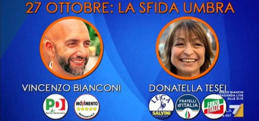 Agenpress. In base ai primi exit poll, la candidata del centrodestra alla guida della Regione Umbria, Donatella Tesei, è nettamente in testa con una forchetta tra il 56,5% e il 60,5%, davanti al rivale Vincenzo Bianconi, candidato dell’alleanza centrosinistra-Ms5, accreditato del 35,5%-39,5%.