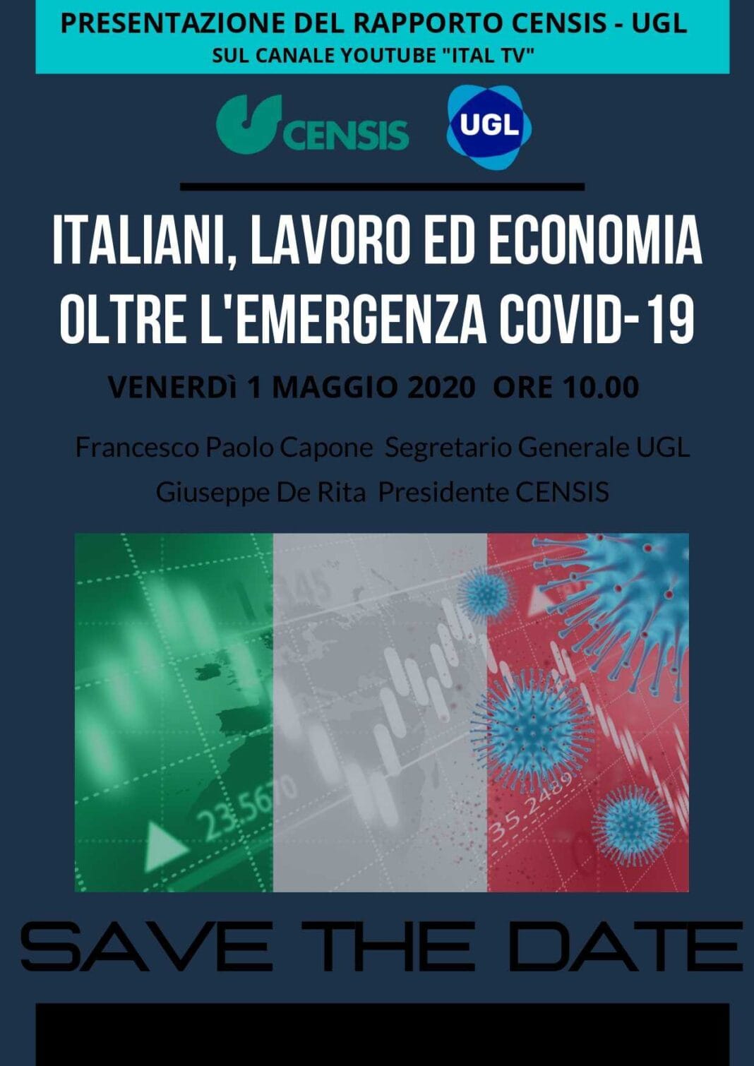 Agenpress. Venerdì primo maggio, l’UGL celebrerà la Festa dei Lavoratori con una conferenza stampa, dalle ore 10 sul canale You Tube ITAL TV, in cui sarà presentato il primo Rapporto Censis-UGL dal titolo “Italiani, lavoro ed economia oltre l’emergenza Covid-19”, realizzato per il 70° anniversario di fondazione del sindacato. Lo studio esamina le modalità con cui gli italiani sono entrati nell’emergenza, come la stanno affrontando e gli effetti che si produrranno al termine di essa.
