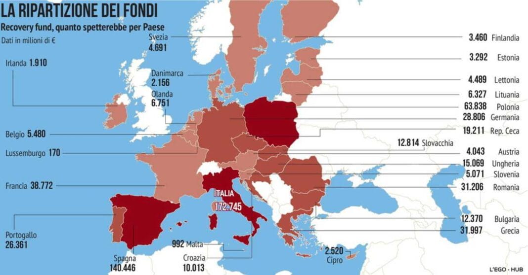 Anche se è attesa una nuova proposta, per ora la base del negoziato lascia intatto l’ammontare totale del Recovery Fund a 750 miliardi. E’ cambiato però l’equilibrio tra i sussidi, scesi a 450 miliardi (dai 500 della precedente proposta), ed i prestiti, ora a 300 miliardi (da 250). Nonostante la sforbiciata ai trasferimenti a fondo perduto, tuttavia, è stata rafforzata di 15 miliardi la Resilience Recovery Facility (RRF) – il vero cuore del Fondo di rilancio che prevede allocazioni dirette ai Paesi secondo precisi parametri – aumentate da 310 miliardi a 325. Tra sussidi e prestiti, una dotazione da 625 miliardi di euro.