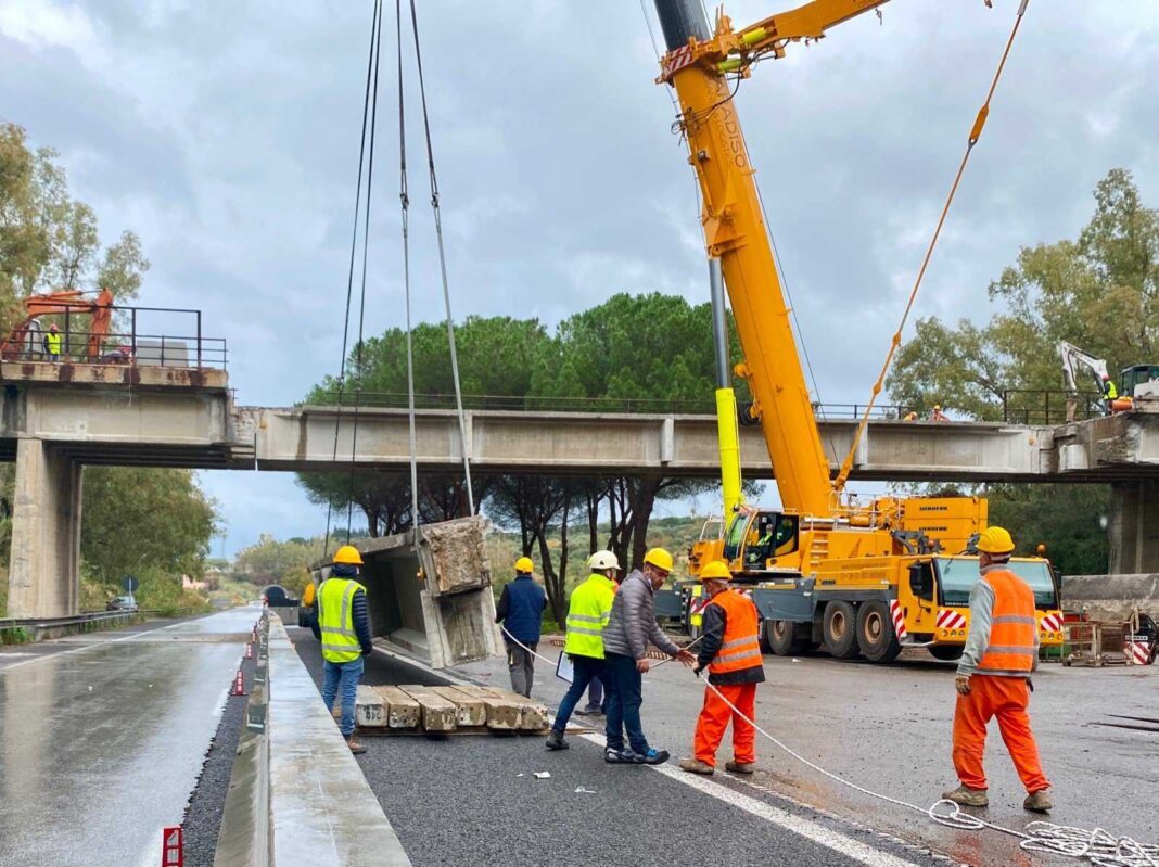 Dopo aver opportunamente tagliato in cinque parti di 30 metri il cavalcavia e predisposto i by-pass funzionali a garantire la continuità dei sottoservizi per abitazioni e imprese (flussi fognari e di rete che ricadevano sulla struttura), un autogrù di 400 tonnellate (giunta via mare da Termini Imerese) ha sollevato e rimosso le cinque travi, del peso di circa 100 tonnellate ciascuna. Gli inerti, dopo essere state ridotti in tronconi da 10 metri, saranno domani trasportati con degli autoarticolati presso un’idonea discarica per essere distrutti, differenziati tra metalli e calcinacci e poi smaltiti. Saranno adesso i calcoli e le indagini avviate sul posto a definire le modalità e i tempi più brevi per la ricostituzione di un nuovo sovrappasso.