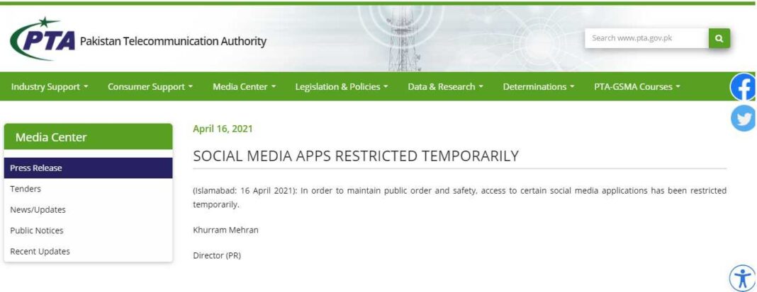 Il blocco è stato deciso dopo che il governo ha messo al bando il movimento fondamentalista Tehreek-e-Labbaik Pakistan (TLP), organizzatore delle manifestazioni dei giorni scorsi, accusandolo tra l’altro di “terrorismo”.