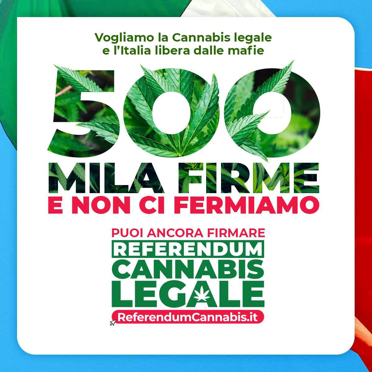 La raccolta firme raggiunge quota 500.000, la cifra limite che permetterà al quesito di andare al voto nella primavera del 2022. Questo referendum è la prima raccolta firme italiana tenutasi interamente online sul sito referendumcannabis.it.