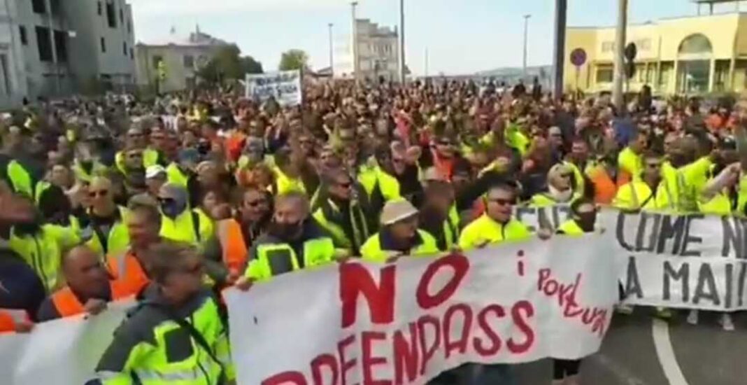 “Siamo disposti ad andare avanti fin quando il green pass non verrà tolto. E’ ora di fermare l’economia che forse è l’unico segnale che possiamo dare a questo stato, per fargli capire che ci sono tante persone in difficoltà, tante persone che rimarranno senza uno stipendio, e solo perché hanno esercitato una scelta libera quella di non farsi il vaccino. Adesso mi sembra ben chiaro che questo passaporto verde è solamente una manovra economica non sanitaria”, ha detto Stefano Puzzer, portavoce del coordinamento dei lavoratori portuali di Trieste, sottolineando che se oggi “non ci saranno novità e il decreto non verrà ritirato domani bloccheremo il porto di Trieste, sia in entrata che in uscita”.