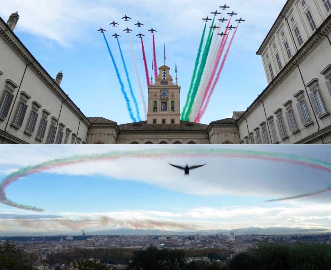 AgenPress – Subito dopo la firma del trattato del Quirinale mentre il capo dello Stato Sergio Mattarella, il presidente francese Emmanuel Macron e il premier Mario Draghi ascoltavano i rispettivi inni nazionali al colle, nel cielo di Roma si sono levate le Frecce Tricolori con la pattuglia acrobatica francese con i colori di ciascuno dei due Paesi. Le Frecce Tricolori volano su Aermacchi mb-339pan, la Patrouille de Ffrance sui Dassault-Dornier alpha jet. Spettacolare il cerchio perfetto disegnato intorno alla Capitale dalle Frecce.
