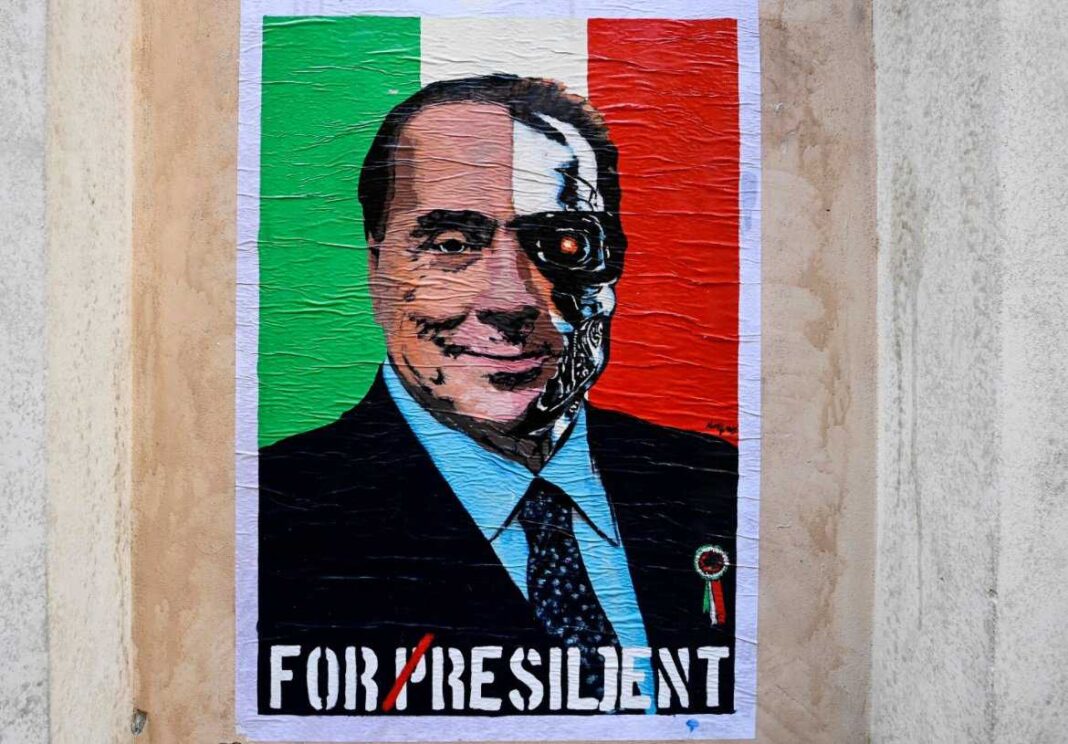 L’immagine dell’ex presidente del consiglio, è ritratta sulla bandiera italiana. Il suo volto però, non è del tutto umano. La “locandina”, che dovrebbe candidarlo “For president”, ha però una correzione sul testo, che diventa: “For resilient”.