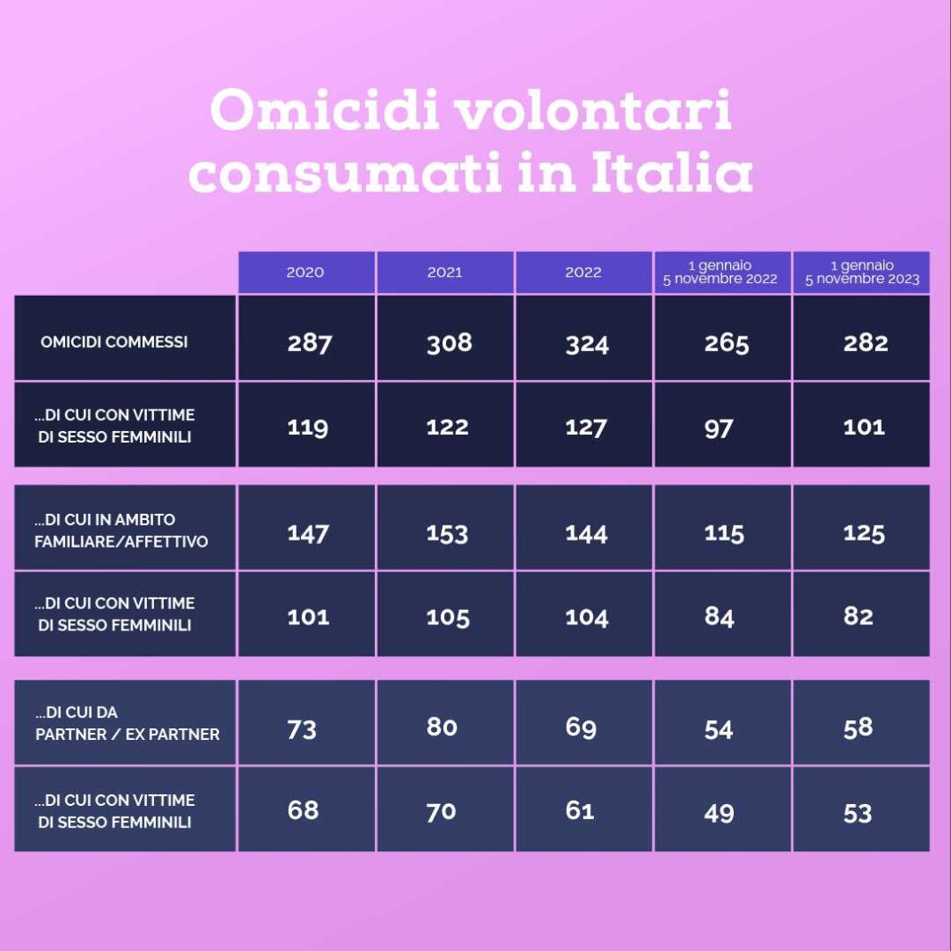 Analizzando i casi di omicidio volontario in Italia, l’infografica dell’Unicusano lancia un allarme, mettendo in evidenza come il fenomeno stia assumendo aspetti preoccupanti: dal 2020 a oggi si registra un aumento sensibile delle vittime: se nel 2020 sono state 287, nel 2022 sono salite a 324. Pubblicando poi i numeri nel periodo gennaio-novembre, emerge come se nel 2022 erano 265 casi accertati, nel 2023 sono saliti a 282. E le donne? Anche qui i dati non sono incoraggianti: lo studio certifica come dalle 119 vittime del 2020 si sia passato alle 127 nel 2022. In quell’anno, nel periodo gennaio-novembre, furono uccise 97 donne, numero che sale a 101 nel 2023.