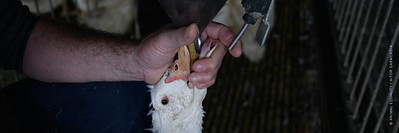 L’alimentazione forzata è una pratica utilizzata su anatre e oche con l’obiettivo di “ingrassare” il loro fegato. Come documentano le immagini diffuse da Animal Equality, negli ultimi 15 giorni di vita in allevamento, gli animali vengono nutriti attraverso un lungo tubo di metallo, che viene infilato nelle loro gole e che somministra loro dai 200 ai 400 grammi di mangime, con gravi rischi di soffocamento e danneggiamento delle pareti dell’esofago.