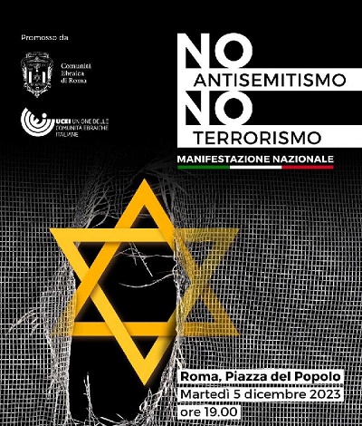 AgenPress. Venerdì 1° dicembre 2023 alle ore 11:30 presso la sede dell’Associazione Stampa Estera, si terrà la conferenza stampa di presentazione della manifestazione nazionale “No all’antisemitismo, no al terrorismo”, promossa dalla Comunità Ebraica di Roma e dall’Unione delle Comunità Ebraiche Italiane, in programma martedì 5 dicembre alle 19:00 in Piazza del Popolo.