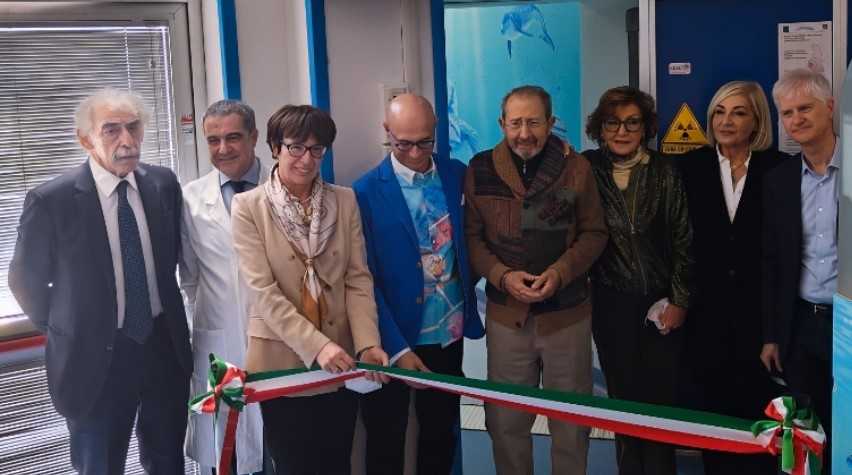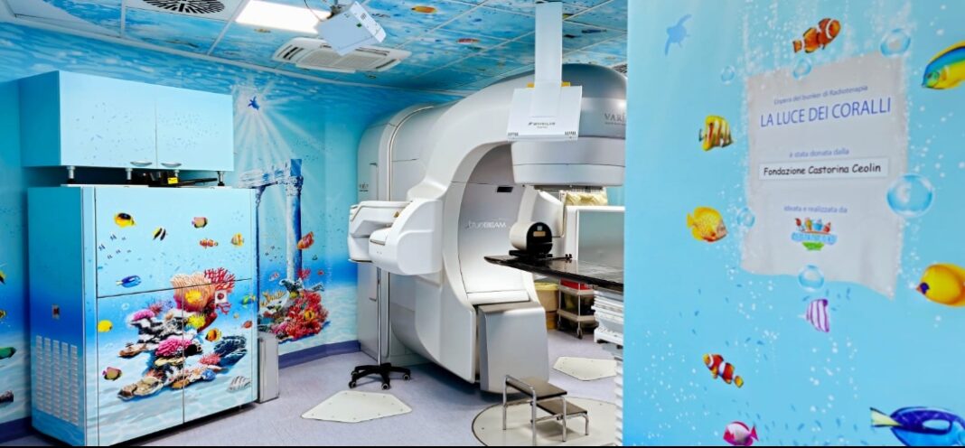 AgenPress. Isole di coralli, pesci colorati, cavallucci e stelle marine, conchiglie. Raggi di luce filtrano dalla superficie e illuminano la brulicante ma pacifica vita sottomarina, con i suoi abitanti che nuotano sereni destreggiandosi tra le colonne e i resti di una città sommersa. Uno straordinario percorso emozionale immersivo che distrae e nello stesso tempo ingenera fiducia. È “La luce dei coralli”, la meravigliosa opera dell’artista Silvio Irilli, realizzata lo scorso weekend e inaugurata stamane: il bunker della Radioterapia dell’Istituto Oncologico Veneto che a Padova ospita l’acceleratore lineare TrueBeam che tratta in particolare i pazienti pediatrici, è stato trasformato in un grande acquario, donato allo IOV per Natale dalla Fondazione “Castorina – Ceolin”. La Fondazione nel marzo scorso aveva già donato un’altra opera di Irilli, che aveva trasformato l’ambulatorio per i pazienti pediatrici e la sala giochi della Radioterapia in un bosco incantato.