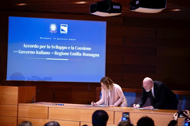 La Regione Emilia-Romagna è, se non sbaglio, la settima Regione a firmare con il Governo l’Accordo di coesione, ma noi arriveremo in tutte le Regioni italiane. La Regione Emilia-Romagna è la prima Regione del 2024, ma questo percorso coinvolge tutti i cittadini italiani e arriva al termine di un lavoro complesso e lungo che il Governo ha fatto, del quale io devo ringraziare soprattutto il Ministro Fitto, che riguarda e ha riguardato la riorganizzazione dei Fondi sviluppo e coesione a monte. Nel senso che – il Presidente Bonaccini lo ricordava – il Fondo di sviluppo e coesione è uno degli strumenti previsti dai Trattati europei, lo strumento principe previsto per combattere la disparità tra i territori e sono risorse strutturali europee alle quali si aggiungono cofinanziamenti nazionali che vengono organizzati su base di cicli pluriennali.