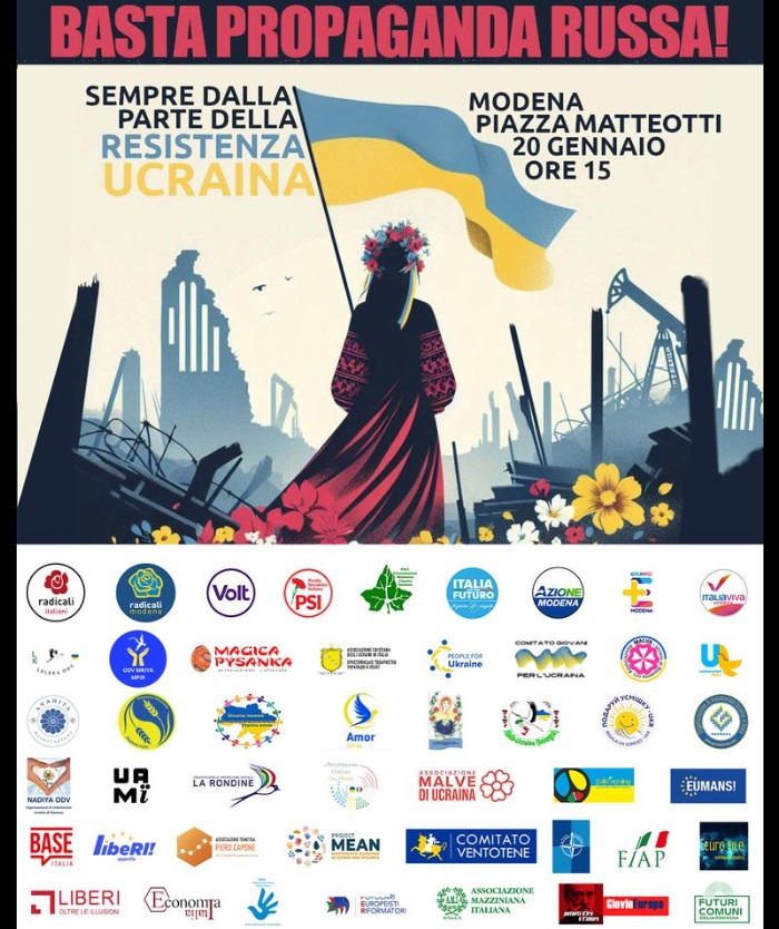 Alla manifestazione modenese, cui ha inviato un messaggio l’ambasciatore ucraino in Italia Yaroslav Melnyk (sottolineando come “la Russia usi tutti i mezzi possibili per imporre stereotipi e demonizzare gli ucraini: dobbiamo dire basta alla propaganda del Cremlino in Italia”) sono intervenuti, oltre a Iervolino, Federico Pizzarotti, presidente +Europa; Silvia Fregolent, senatrice di Italia Viva; Matteo Richetti, capogruppo di Azione alla Camera dei deputati, Oles Horodetskyy, presidente Associazione Cristiana Ucraini in Italia e gli esponenti di oltre 40 associazioni presenti.