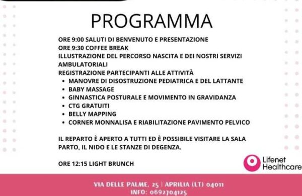 Si parlerà di ostetricia e ginecologia e, oltre alla possibilità di visitare il nido, la sala parto e le stanze di degenza, sono state pensate diverse attività: dalla baby massage alla ginnastica posturale, dalla belly mapping (la “mappatura” del pancione) alla riabilitazione del pavimento pelvico. La mattinata si concluderà con un light lunch.