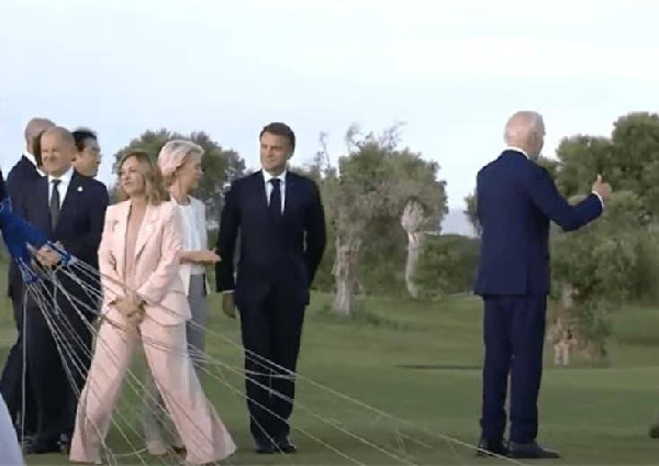 Biden apparentemente disorientato, dove sembrerebbe allontanarsi dagli altri leader mondiali mentre guarda uno spettacolo di paracadutismo durante il vertice del G7 svoltosi la scorsa settimana in Italia.