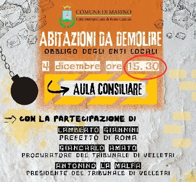 AgenPress. Si svolgerà mercoledì 4 dicembre p.v., alle ore 15.30, presso l’Aula Consiliare di Palazzo Colonna a Marino, il convegno sul problema degli abusi edilizi destinati ad abitazione. L’incontro, fortemente voluto dall’Amministrazione comunale in collaborazione con la Fondazione Gazzetta Amministrativa della Repubblica Italiana, vedrà la partecipazione di Sua Eccellenza il Prefetto di Roma Lamberto Giannini, del Procuratore della Repubblica di Velletri Giancarlo Amato e del Presidente del Tribunale di Velletri Antonino La Malfa per approfondire l’argomento della richiesta di demolizione delle abitazioni che rappresenta di fatto un obbligo degli Enti Locali.