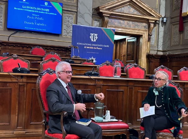 Il ricordo di Ciampi è entrato nel vivo con un dialogo tra Paolo Peluffo, già portavoce del Presidente Ciampi e presidente del Comitato Scientifico della Fondazione Insigniti OMRI, e la giornalista Daniela Tagliafico, che ha guidato per diversi anni la Struttura RAI del Quirinale. Nel ricordare, anche con interessanti retroscena, la “svolta di Ciampi”, Paolo Peluffo ha condiviso con il folto pubblico alcuni episodi particolarmente significativi, come “la riapertura del Vittoriano, l’istituzione del Giorno della Memoria, il ripristino della parata militare del 2 giugno e le visite a tutte le Province d’Italia”, evidenziando lo spirito e le finalità della campagna di comunicazione istituzionale che ha segnato profondamente quel settennato.