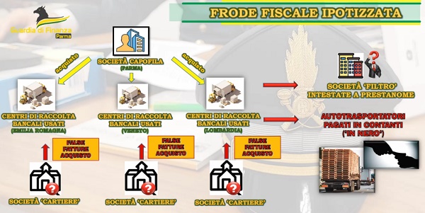 Dagli approfondimenti svolti è stato possibile ricostruire un articolato meccanismo illecito il cui centro nevralgico sarebbe da individuarsi in molteplici centri di raccolta di bancali, collocati in Emilia Romagna, Lombardia e Veneto, tutti facenti capo a società costituite ad hoc dal gruppo e ad esso serventi (le cd. società filtro), poi risultate mere ramificazioni della società capofila – nota impresa del settore operante in provincia di Parma – funzionali all’acquisto “in nero” di bancali usati dagli autotrasportatori.