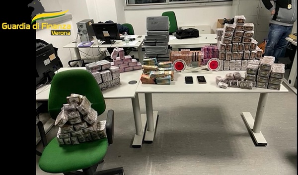 L’operazione antidroga condotta dalla Sezione Mobile del Nucleo di Polizia Economico-Finanziaria scaligero ha consentito di sequestrare circa 83 chilogrammi di cocaina, 103 chilogrammi di hashish e 170.000 euro in contanti.