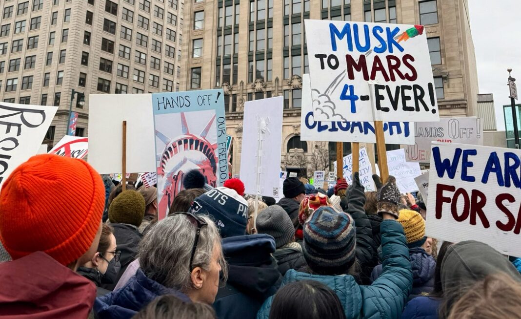 A Washington DC, migliaia di manifestanti si sono radunati per assistere ai discorsi dei legislatori democratici. Molti commenti si sono concentrati sul ruolo svolto nell’amministrazione Trump dai ricchi donatori, in particolare Elon Musk, che ha svolto il ruolo di consigliere del presidente e ha guidato uno sforzo per tagliare drasticamente la spesa e la forza lavoro federale.