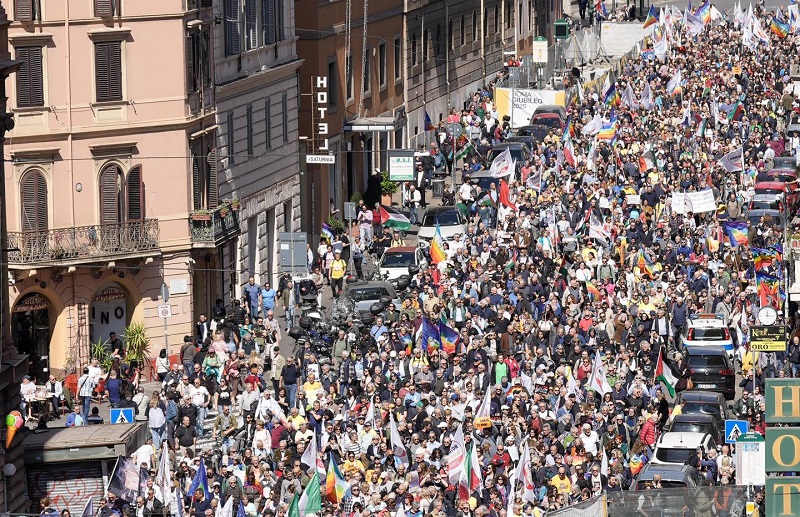 In piazza c’era anche una delegazione del Pd, “io sono contento per la partecipazione del Pd, mi sono venuti a salutare Boccia, Ruotolo, Taruffi ed altri: è importante ed è anche una valutazione del Pd. Se vuoi costruire un’alternativa al governo devi andare avanti e guardare gli obiettivi”.