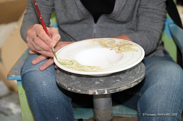 I partecipanti sono stati accolti dal maestro ceramista Giuseppe Fasano, che ha illustrato e dimostrato dal vivo le antiche tecniche di lavorazione ceramica tramandate di generazione in generazione. Al suo fianco, il maestro ceramista Fabio Lenti e la decoratrice Tina Incalza, hanno curato insieme a lui la realizzazione di un piatto ceramico speciale, commissionato dalla Fondazione. Al centro del piatto è stato raffigurato il logo della Fondazione OMRI, circondato da decorazioni simboliche: un’opera in cui luce, colore e armonia dialogano con la tecnica e l’eleganza espressiva.