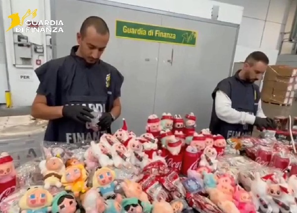 Dopo un’accurata ispezione doganale, la merce è risultata costituita principalmente da set di figurine raffiguranti personaggi e frasi prive di senso generati mediante intelligenza artificiale, largamente diffusi tra i prodotti commerciali rivolti agli adolescenti, nonché da mini pupazzi da collezione in stile “urban toy” recanti marchi quali: “Skifidol italian brainrot”, “Disney”, “Pop Mart”, “The Monster”, “Biginto Energy Pop Mart”, “Lovely Doll Pop Mart” e “Cocacola Pop Mart”.