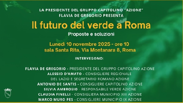 AgenPress. All’incontro parteciperanno Flavia De Gregorio, capogruppo capitolino di Azione; Alessio D’Amato, consigliere regionale del Lazio e segretario romano di Azione; Antonio De Santis, consigliere capitolino di Azione; Silvia Ambrosio, referente per il verde di Azione; Claudia Finelli, consigliera Municipio XIII di Azione, e Marco Muro Pes, consigliere Municipio IX di Azione.