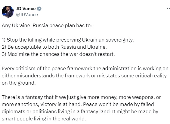 AgenPress. Qualsiasi piano per porre fine alla guerra della Russia in Ucraina dovrebbe proteggere la sovranità dell’Ucraina ed essere accettabile per entrambi i paesi, ha scritto venerdì il vicepresidente degli Stati Uniti JD Vance sul sito web X.
