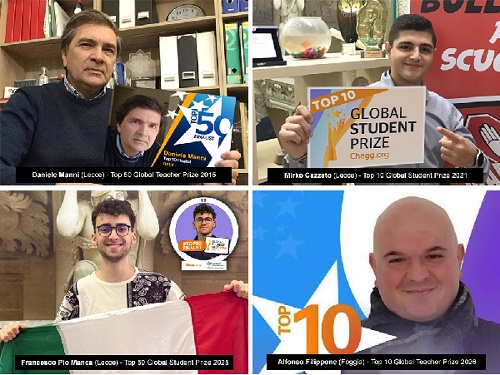 Nei 10 anni di attività del Global Teacher Prize sono 11 i docenti italiani selezionati tra i finalisti, due dei quali sono pugliesi (Daniele Manni Top 50 nel 2015 da Lecce e Alfonso Filippone Top 10 nel 2026 da Foggia), mentre nei 5 anni del Global Student Prize sono solo 3 gli studenti italiani giunti in finale, due su tre sono pugliesi: Mirko Cazzato Top 10 nel 2021 e Francesco Pio Manca Top 50 nel 2025, entrambi di Lecce.