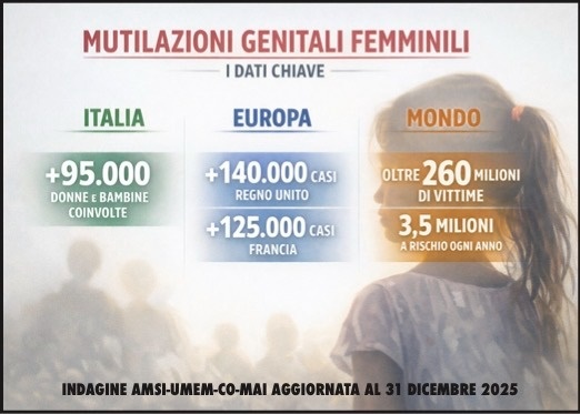 AgenPress. In occasione della Giornata internazionale contro le mutilazioni genitali femminili (oggi 6 febbraio 2026), la rete associativa composta da AMSI (Associazione Medici di Origine Straniera in Italia), UMEM (Unione Medica Euromediterranea), Co-mai (Comunità del Mondo Arabo in Italia) e dal Movimento Internazionale Uniti per Unire richiama l’attenzione su una pratica che continua a colpire milioni di bambine e giovani donne nel mondo, mostrando segnali di crescita costante anche nei Paesi europei, inclusa l’Italia.